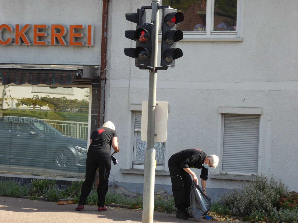 Zuletzt weise ich noch auf die ausgestreckten Arme unserer lady in red hin. „Na klar,“ scheint diese zu sagen, „versteht sich von selbst: Ich geh‘ jetzt einfach los!“ Und also wird es ernst: Gleich soll es Grün werden, und dann eilt die Kleene voran, mit rhythmisch unterstützenden Armen und wippenden Zöpfen – und wir werden sie mit den Augen und dem Herzen begleiten: Da eine Ampelphase genügen muß, weil die Straße nicht gesperrt werden kann, überqueren nur, stellvertretend für uns alle, der ‚Chef‘ von Eislingen und die ‚Chefin‘ von efa die Straße. Und wenn die beiden wieder zurückgekommen sind, wollen wir zusammen das Glas bzw. das Fläschchen erheben – auf die Ampelfrauen, auf Gerechtigkeit in der Welt!
