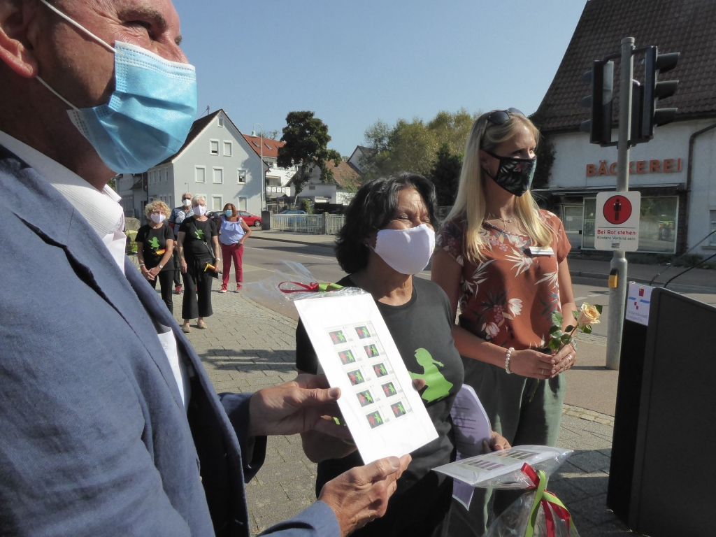Am vergangenen Samstag sind die beiden Ampeln mit Ampelfrauen in einer feinen Feier offiziell eröffnet worden. OB Heininger stellte die Ampelfrauen in eine Reihe mit Städten wie Mainz(elmännchen)und Trier (Karl Marx). EfA-Vorsitzende Gönül Neuen erzählte den Ablauf der Gespräche mit der Stadtverwaltung ('Offene Türen eingerannt!')und dankte allen EfA-Frauen für Ihre Mithilfe, die sehr vielfältig gezeigt wurde: Briefmarken, T-Shirts, Cupcakes, Gesichtsmasken mit dem neuen Ampelfrauenstempel, usw. OB Heininger und Frau Dürner bekamen die ersten Ampelfrauen-Briefmarken als Geschenk überreicht. EfA-Mitglied Tina Stroheker sprach über 'Kleine Zeichen, große Zeichen', den Umgang mit dem Thema Frauen (siehe unten).