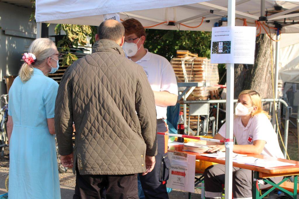Zwischen 200 und 400 Test nahmen die Rotkreuz-Ehrenamtlichen pro Tag ab. Spitzenreiter war der letzte Feriensamstag mit 750 getesteten Personen. Auch Oliver Dürr und Andreas Pfeiffer testen an diesem letzten Ferienwochenende und hoffen am frühen Abend auf einen ruhigen Dienst. Bis spät in die Nacht hinein sind sie vor Ort, müssen dann noch nach Hause fahren. Ob sie am nächsten Tag frei haben? Alle lachen: „Wir arbeiten morgen früh ganz normal“.