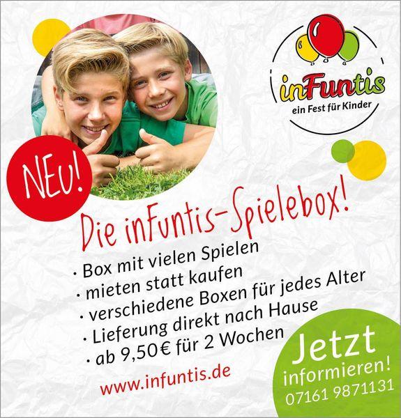Auf https://infuntis.de/spielebox/ eine Spielebox aussuchen, bestellen unter 'Testfamilie'. Die Box kommt dann - Verfügbarkeit vorausgesetzt- für zwei Wochen kostenlos zu ihnen nach Haus. Im Gegenzug bittet Sonja Mühleis um Bewertung der Aktion.