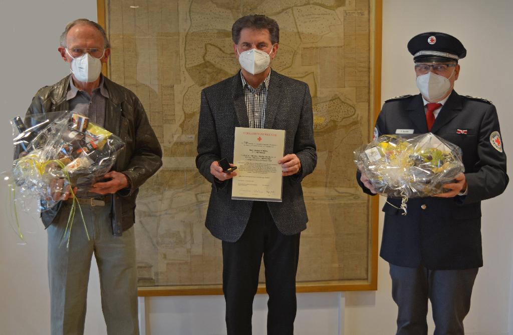 m Bild v.l.n.r. Gerhard Kneifel, OB Klaus Heininger und Thomas Ruckh bei der Übergabe der Ehrungsgaben für die außergewöhnliche Anzahl von 150 Blutspenden.