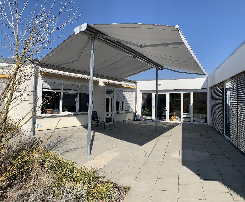 Insgesamt kamen 4000 € zusammen. Auch die Firma Stahlbau Nägele meldete sich. Sie wollten umsonst ein großes Stahlgerüst bauen. An dem sollten zwei riesige Markisen aufgehängt werden. Die Firma Lampert machte uns auch ein tolles Geschenk: Ihnen mussten wir nur das Material für die Markisen bezahlen. Leider war es schwer eine Baufirma zu finden. Das Stahlgerüst musste betoniert werden. Im Winter 2020, machte das die Firma Müller für wenig Geld. Endlich konnte alles montiert werden. Auf das Frühjahr und Sommer 2021 freuen sich alle im Förder – und Betreuungsbereich über den Sonnenschutz. Dies ermöglicht, dass Rollstuhlfahrer viel besser draußen fahren können. Weil das Stahlgerüst nur 2 Stützen hat. Vorher mussten wir mind. 10 Sonnenschirme aufstellen. Menschen, die Anfälle bekommen, können nur im Schatten draußen sein. Diese haben dadurch mehr Freiheit und frische Luft. Vielen Dank an alle Unterstützer.