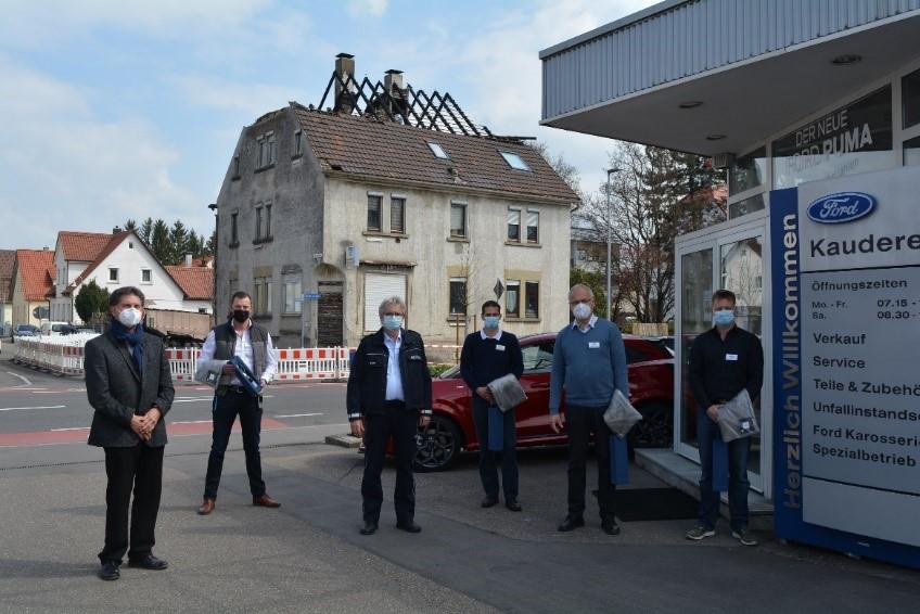 „Für uns war es gar kein Thema“ berichtet Tobias Kaißer, einer der Geschäftsführer des Autohauses und Ersthelfer, der zusammen mit seinen Mitarbeitern Gottfried König und Daniel Kautzmann, den Bewohnern zur Hilfe eilten. Bereits vor dem Eintreffen der Einsatzkräfte haben sie einer Mutter mit ihren zwei Kindern sowie einer Freundin, die mit ihrem Kind zu Besuch war, bei dem Ausstieg durch das Wohnzimmerfenster im Erdgeschoss geholfen. „Da reicht nicht nur ein Lob – so eine Zivilcourage muss anerkannt werden“ unterstreicht Oberbürgermeister Heininger, der den tatkräftigen Einsatz der Ersthelfer noch einmal schilderte. Neben der Familie brachten sie auch ein Auto eines Bewohners, der im oberen Stockwerk auf die Rettung der Feuerwehr wartete, in Sicherheit. Das Autohaus stellte sofort den Betroffenen ihre Räumlichkeiten zur Verfügung, um sie zu versorgen. „Wir haben sie gleich rein geholt, weg vom Geschehen, damit die Kinder nicht alles mitbekommen“ berichtet Kaißer. Besonders für die Kinder war das wichtig, für die so ein Brand sehr traumatisierend sein kann, ergänzt Polizeirevierleiter Klaus Stipp. Dass die Räumlichkeiten so spontan genutzt werden durften, erleichterte die Arbeit der Polizei. „Hier wurde beispielhaft und vorbildhaft Zivilcourage gezeigt“ sagt Stipp. Auch eine Mitarbeiterin der Stadtverwaltung war noch während der Löscharbeiten direkt vor Ort und nahm das Gespräch mit den Bewohnern auf, um unter anderem die Unterbringung der Bewohner abzuklären.