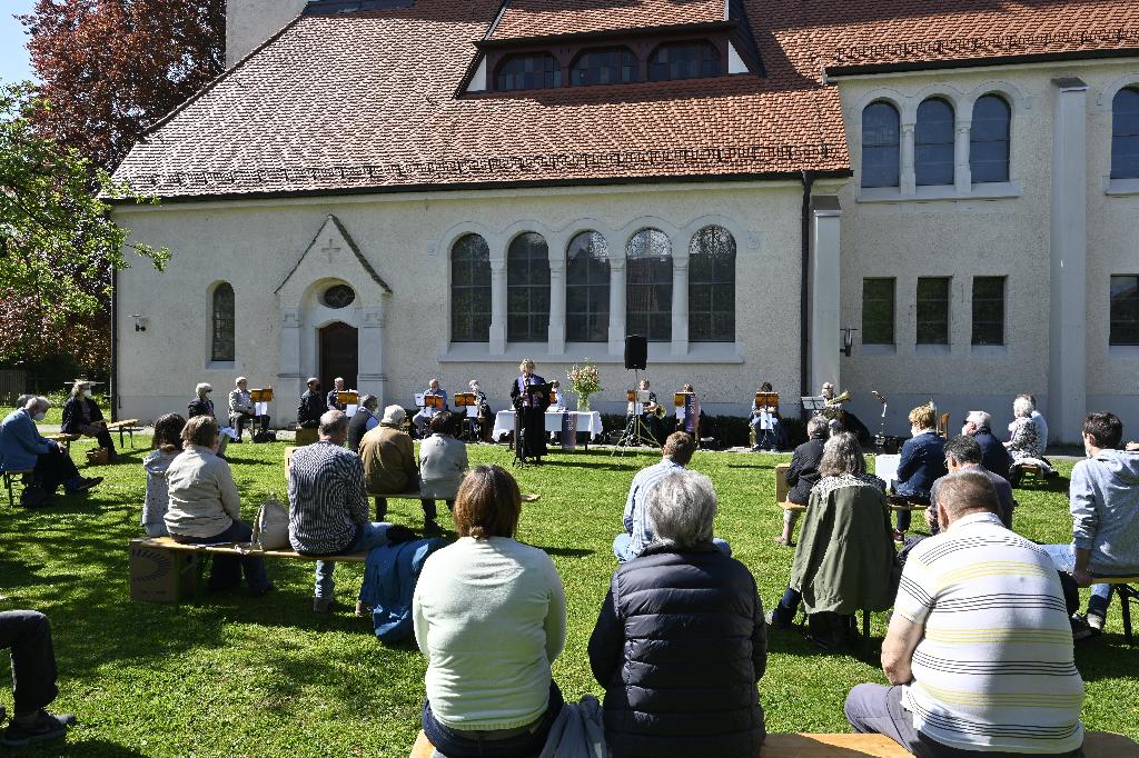 Dem Motto des 3. Ökumenischen Kirchentags folgend fand am vergangenen Donnerstag mit Abstand, Masken und dem Posaunenchor bei strahlendem Sonnenschein ein Gottesdienst auf der Kirchwiese hinter der Christuskirche statt.