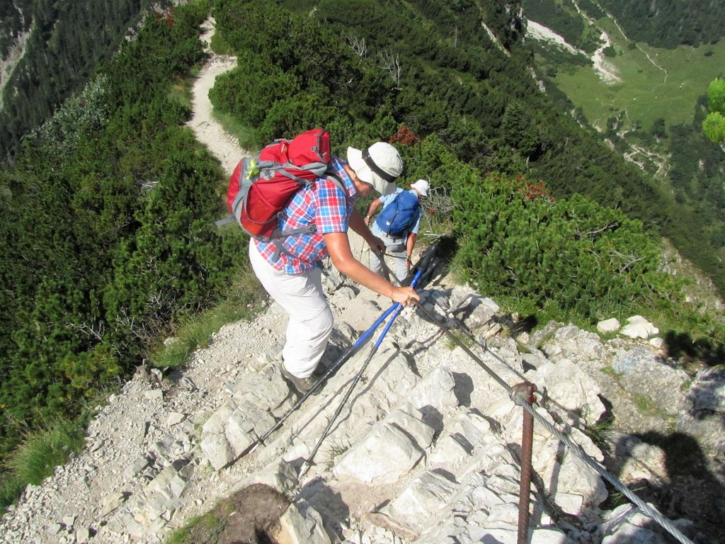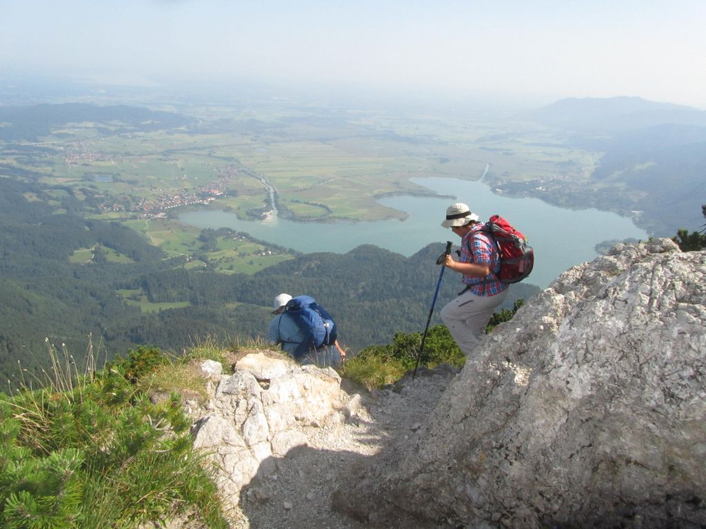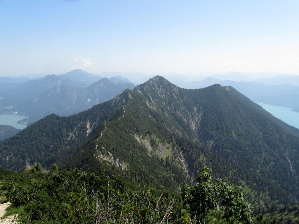 Vom gleichnamigen Ort Walchensee am Walchensee (800 m ü.N.N.)fuhr man in wenigen Minuten mit der Herzogstandseilbahn zum Fahrenkopf (1627). Auf guten Wegen wurde der Herzogstand Gipfel (1731) erreicht. Im stetigen Auf- und Ab folgte die Kammüberschreitung zum Heimgarten, ein echter Klassiker. Der schmale Weg war gut gesichert. Immer wieder gab es grandiose Talsichten zum Kochel-, Walchen- und Staffelsee. Am Gipfelkreuz des Heimgarten (1790 m) waren die Blicke ins Karwendelgebirge und den Alpenhauptkamm mit seinen Dreitausendern einfach wunderbar. Der Abstieg über die Ohlstädter Alm (1423) zurück nach Walchensee bei hochsommerlichen Temperaturen zog sich lange hin. Es war eine tolle Tour. Retour über Bichl, Bad Tölz fuhr man ins Quartier nach Lenggries. Mit der Brauneckbahn fuhr man am anderen Morgen zum Brauneckhaus (1520 m). Es folgte die Überschreitung über den Latschenkopf (1712 m) und die anspruchsvollen schroffigen 3 Achselköpfe zum Rotöhrsattel (1615) und hinauf zum Gipfelkreuz der Benediktenwand (1801 m) Bei den zahlreichen Auf- und Gegenanstiege war eine gehörige Portion Kondition und Trittsicherheit gefragt. Fixe Drahtseile halfen bei der leichten Kraxelei in den luftigen und felsigen Passagen. Belohnt wurde man am Gipfel mit einer herrlichen unverstellbaren Aussicht in allen Richtungen. Wegen der angekündigten und näher kommenden Gewitterfront war das Gipfelglück nur von kurzer Dauer. Über den Westgrad führte der Weg zur Glaswandscharte (1324). Beim Abstieg ins Glasbachtal zur Lainl-Alm (906 m) wurde man doch noch kräftig eingeseift, was aber der guten Stimmung keinen Abbruch tat. Die Wirtsleute fuhren uns durch die Jauchenau zurück nach Lenggries.