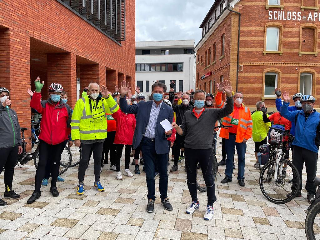 Oberbürgermeister Klaus Heininger nahm die Radlerinnen und Radler in Empfang und übergab eine Spende an den Hospizverein