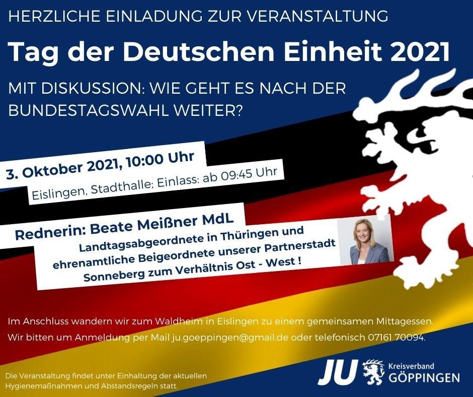 Der diesjährige Tag der Deutschen Einheit, steht im ganz im Sinne der Bundestagswahl. Die Junge Union (JU) Kreisverband Göppingen lädt traditionell auch in diesem Jahr zu einer Veranstaltung und einem Festakt zum Tag der Deutschen Einheit am 3. Oktober 2021 ein, um an diesen besonderen Tag der deutschen Geschichte zu erinnern. Gemeinsam mit dem CDU-Stadtverband Eislingen wird die diesjährige Veranstaltung in der Stadthalle Eislingen um 10:00 Uhr (Einlass ab 09:45 Uhr) stattfinden.