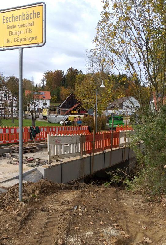 Die vorhandene Brücke war zuletzt in einem sehr schlechten Zustand. Sie stellt die alleinige Zufahrt für den motorisierten Verkehr von der Kreisstraße K 1404 zum Weiler Eschenbäche dar. Die vorhandene Tragfähigkeit war mit 16 t Verkehrslast für die tatsächliche Nutzung unzureichend, weshalb eine Erneuerung unbedingt erforderlich war. Die Baukosten belaufen sich auf rund 420.000 €. Für den Neubau hat die Stadt Eislingen Fördermittel des Landes Baden-Württemberg über den Sanierungsfond Brücken in Höhe von 127.000 € erhalten.