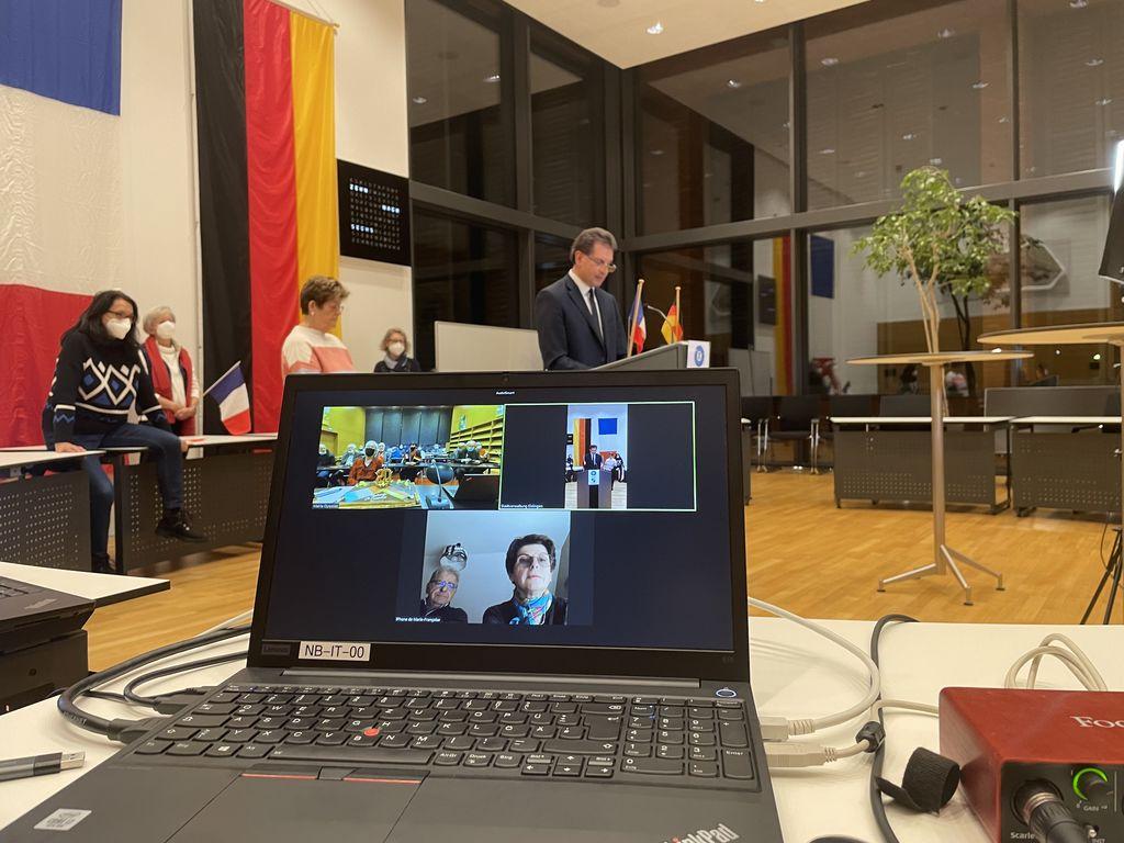 virtuell in die Kamera gerichtet an seinen Amtskollegen Bürgermeister Michel Perraud in Oyonnax. Beide Stadtoberhäupter hatten sich mit Mitgliedern der Partnerschaftskomitees und deren Vorsitzenden in den jeweilig festlich dekorierten Ratssälen versammelt, um den Freundschaftspakt erneut zu besiegeln. Bleu-Blanc-rouge und und Schwarz-Rot- Gold waren auf beiden Seiten die dominierenden Farben, die sowohl den Ratssaal in Eislingen, als auch in Oyonnax schmückten und dem Festakt eine feierliche Atmosphäre verliehen. In ihren Grußbotschaften bekräftigen beide Stadtoberhäupter, dass es weiterhin das Ziel ist, die Bürgerinnen und Bürger noch enger zusammenzuführen und Europa zu stärken. Mit der erneuten Unterzeichnung des Partnerschaftsvertrages wurde dieses Versprechen feierlich besiegelt. Die Vorsitzenden der Partnerschaftskomitees, Karin Schuster und Francoise Collet übersetzten in die jeweilige Landessprache und kommentierten den Festakt zusammen mit den Mitgliedern beider Organisationen mit kräftigem Applaus. Dass diese deutsch-französische Verbindung beide Städte bereichert, ist unbestritten. Mit den Jahren sind äußerst lebendige und herzliche Freundschaften zwischen den Bürgerinnen und Bürgern beider Städte entstanden. Austauschprogramme, Konzerte, Kunstausstellungen, Schülerpraktika und sportliche Begegnungen sind nur einige Beispiele der zahlreichen Bausteine, die der Freundschaft ein solides Fundament geben. Vor allem auch durch den Leitgedanken der privaten Unterbringungen der jeweiligen Gäste in den Partnerstädten, gelang es, über die Jahre ein stabiles Netz in der Bürgerschaft zu knüpfen, die auch den Kontaktbeschränkungen in Pandemiezeiten standhält.
