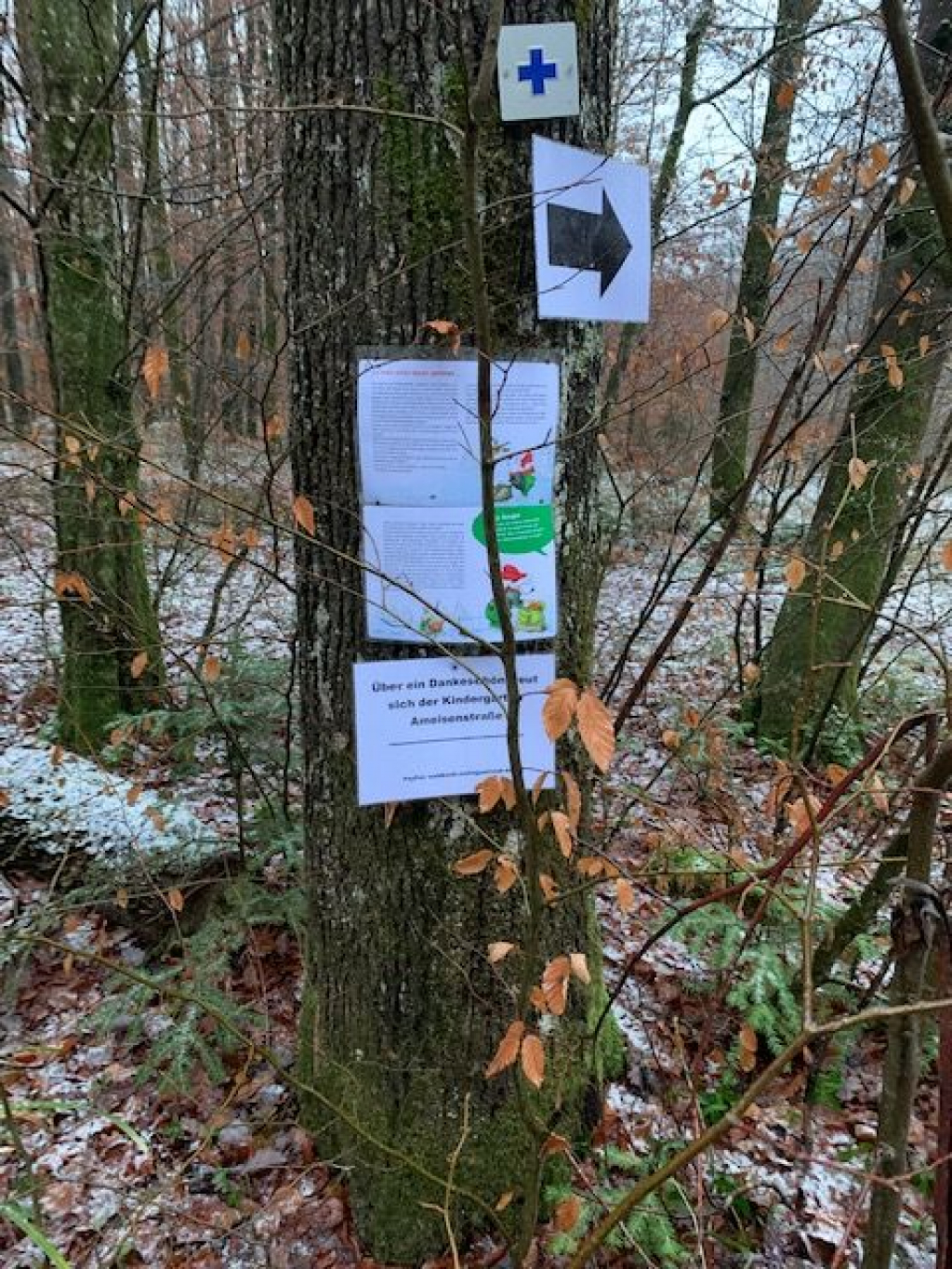 Auch wenn es sicher noch schöner wäre, im frisch gefallenen Schnee den Wegweisern des Weihnachtswunderpfades im Eislinger Brentenholzwald zu folgen. Aber richtig gekleidet, macht auch die Erkundung dieses vom Waldkindergarten Ameisenstraße geschaffenen Wunderpfad spaß. |