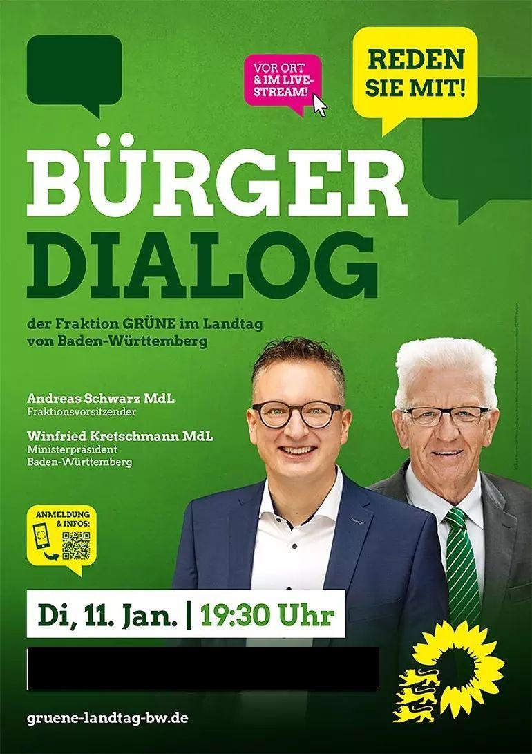 Zu einem digitalen Bürgerdialog lädt am 11.01.2022, 19:30 Uhr die Landtagsfraktion von Bündnis 90/DIE GRÜNEN. Eine Notärztin, ein Schulsprecher und ein Energiegenossenschaftler aus der Region Göppingen diskutieren dabei mit Ministerpräsident Winfried Kretschmann und dem Fraktionsvorsitzenden der Grünen im Landtag, Andreas Schwarz.