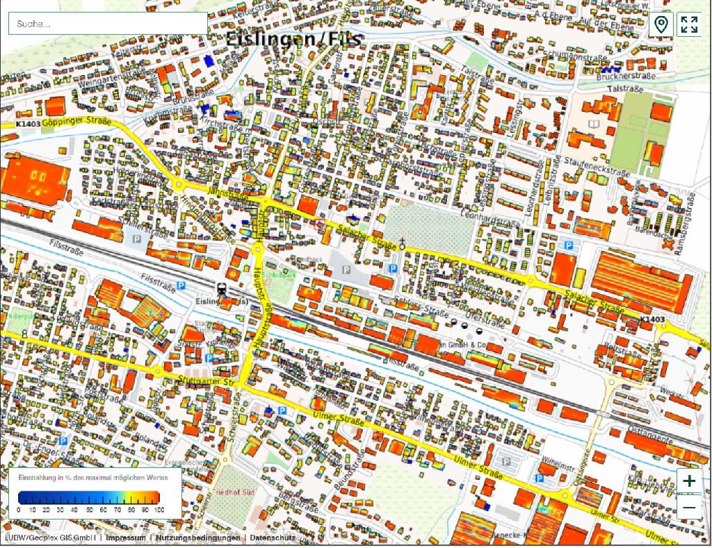 Das erweiterte Solarkataster der LUBW zeigt für Eislingen ein großes Potential für Sonnenenergie