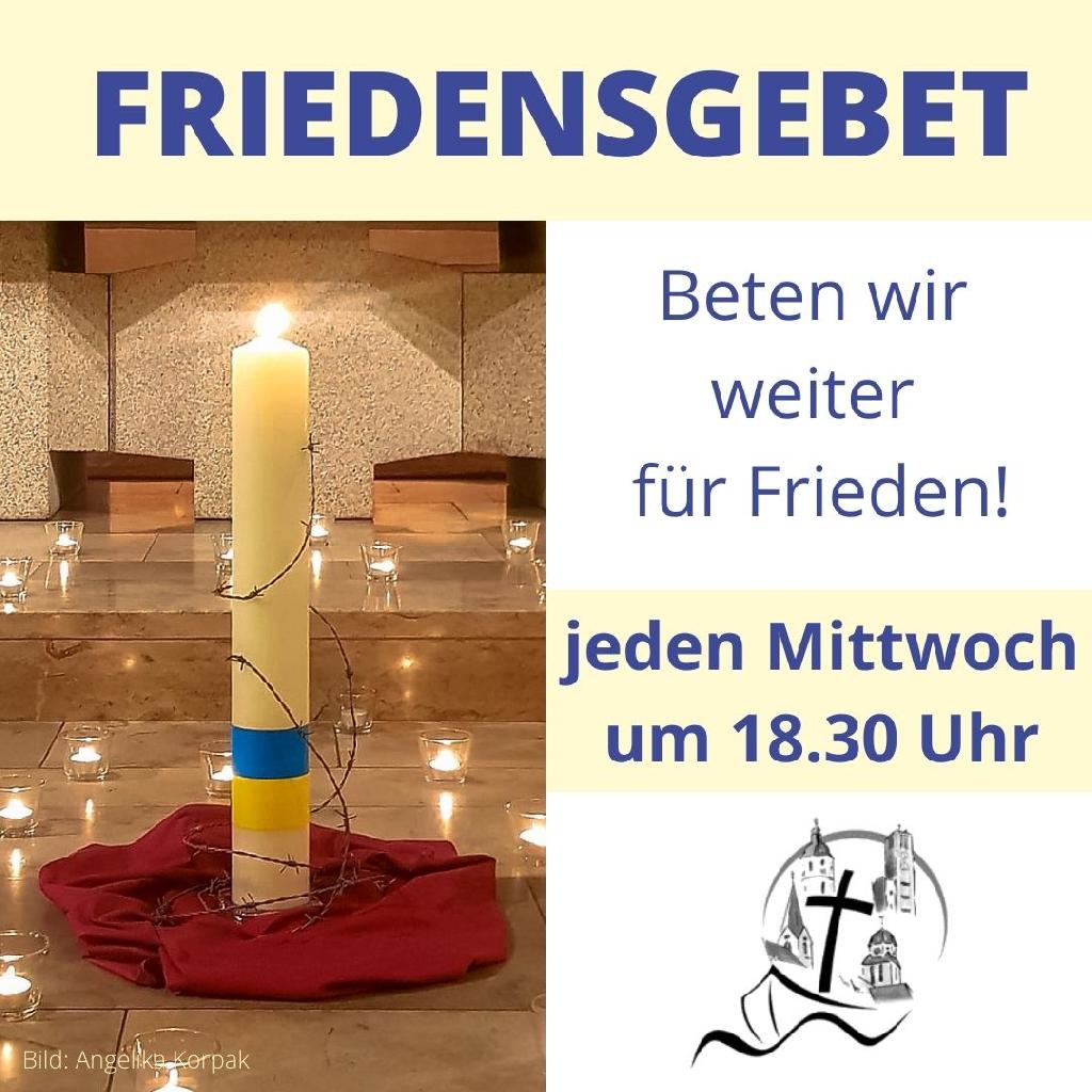 bis auf weiteres finden jeden Mittwoch um 18.30 Uhr (Ausnahme: 13.4.) Friedensgebet statt. Dazu laden die evangelischen und katholische Kirchengemeinden ein.