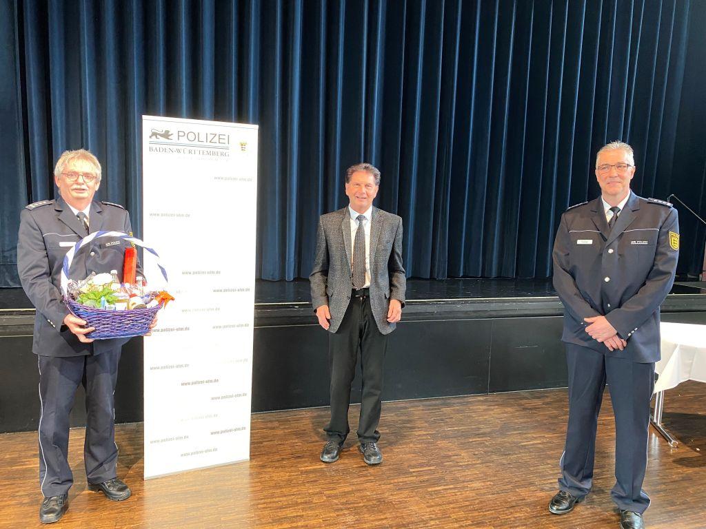 Bei der damaligen Neubesetzung des Revierleiters war Klaus Stipp der Wunschkandidat für diese Position und aus heutiger Sicht des Stadtoberhauptes ein Glücksfall für Eislingen. Rund um die Uhr war Klaus Stipp als Leiter des Eislinger Polizeirevieres für die Sicherheit von über 56.000 Einwohnerinnen und Einwohner im Fils- und Lautertal verantwortlich. Dabei seien die Anforderungen an die Polizei, wie auch das Sicherheitsbedürfnis der Bürgerschaft in diesem großen Verantwortungsbereich in den vergangenen Jahren stetig gewachsen, verdeutlichte OB Klaus Heininger. Als eine wichtige Etappe benannte er den Umzug in das neue Reviergebäude in der Ulmer Straße, bei dessen Planung Klaus Stipp die fachliche Bauberatung innehatte. In all den Jahren zeigte sich immer wieder die guten Zusammenarbeit, unter anderem bei zahlreichen Sondereinsätzen, wie zum Beispiel bei Stadtfesten und Weihnachtsmärkten, die Verkehrssicherung beim Schulbeginn und Kerzenspaziergängen sowie die Präsenz im Straßenverkehr. Für das kooperative Miteinander bedankte sich Oberbürgermeister Klaus Heininger im Namen des Gemeinderates und den Mitarbeiterinnen und Mitarbeitern der Stadtverwaltung und verabschiedete den versierten Eislinger Revierleiter mit den besten Wünschen in den neuen Lebensabschnitt. Dazu überreichte er ihm ein besonderes Geschenk, das ‚Eislinger Leistungsklörble‘, sorgfältig bestickt mit ausgewählten Produkten, die in unterschiedlichen Eislinger Betrieben hergestellt werden.