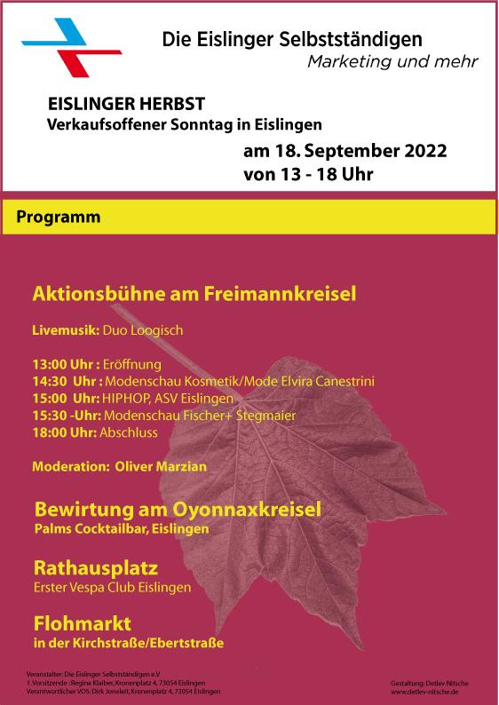 Am 18.09.2022 werden die Eislinger Selbstständigen im Rahmen des Eislinger Herbstes einen Verkaufsoffenen Sonntag durchführen.