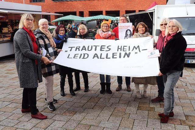 - weist efa mit einem Banner „Trautes Heim, Leid allein“ auf häusliche Gewalt hin
