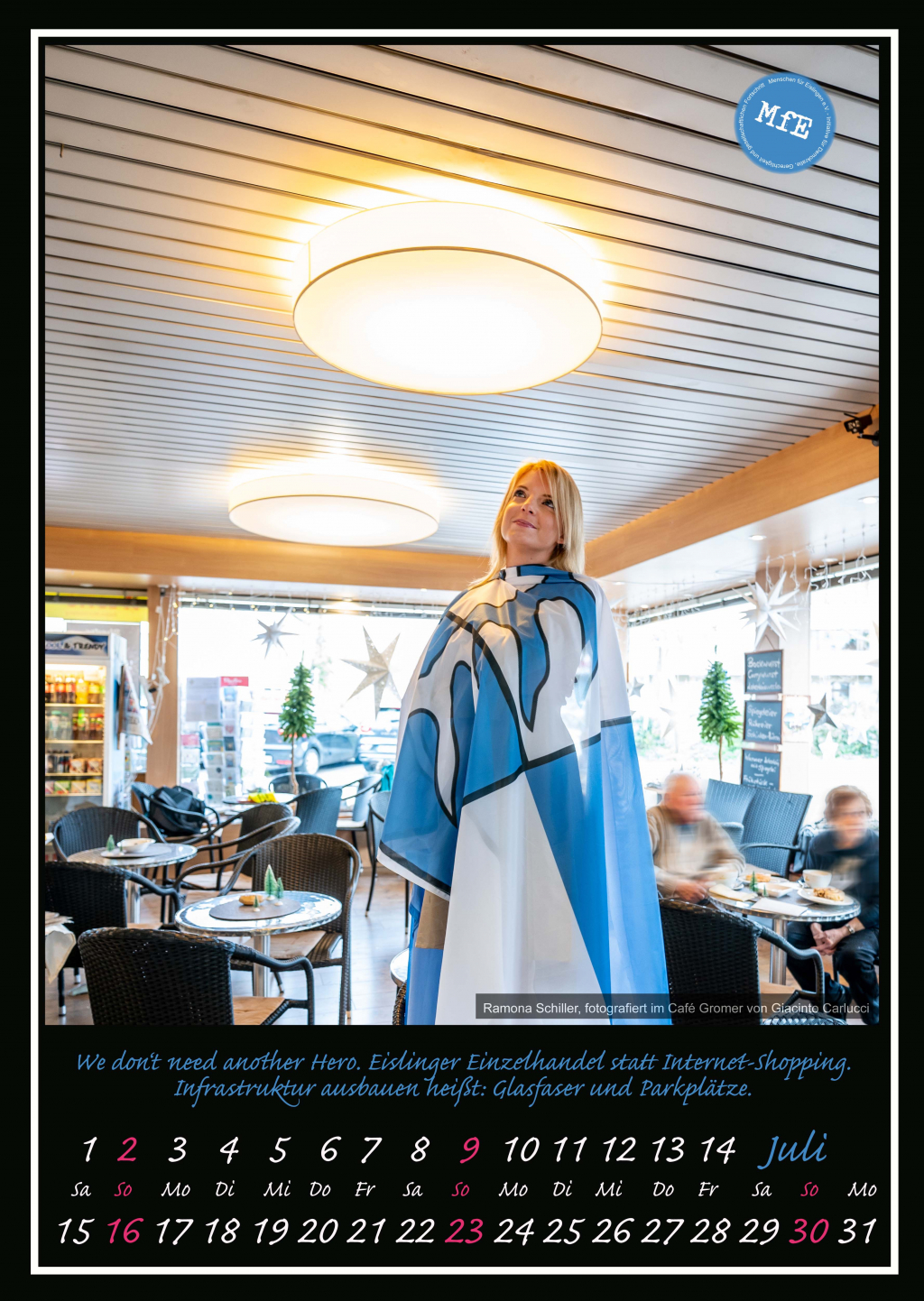 Das Beste kommt zum Schluß! Der Kalender der Menschen für Eislingen (MfE e.V.) ist ab sofort exklusiv im Café Gromer (Bahnhofstraße 5) erhältlich. Der Kalender, der in einer Reihe mit seinen beiden Vorgängerausgaben steht und dennoch mit individuellem Charakter überrascht, ist mit seinen von Giacinto Carlucci perfekt und unnachahmlich ins Bild gesetzten Motiven jetzt schon bei vielen der Eislinger Kult-Kalender. Kunst meets Kleichberechtigung.