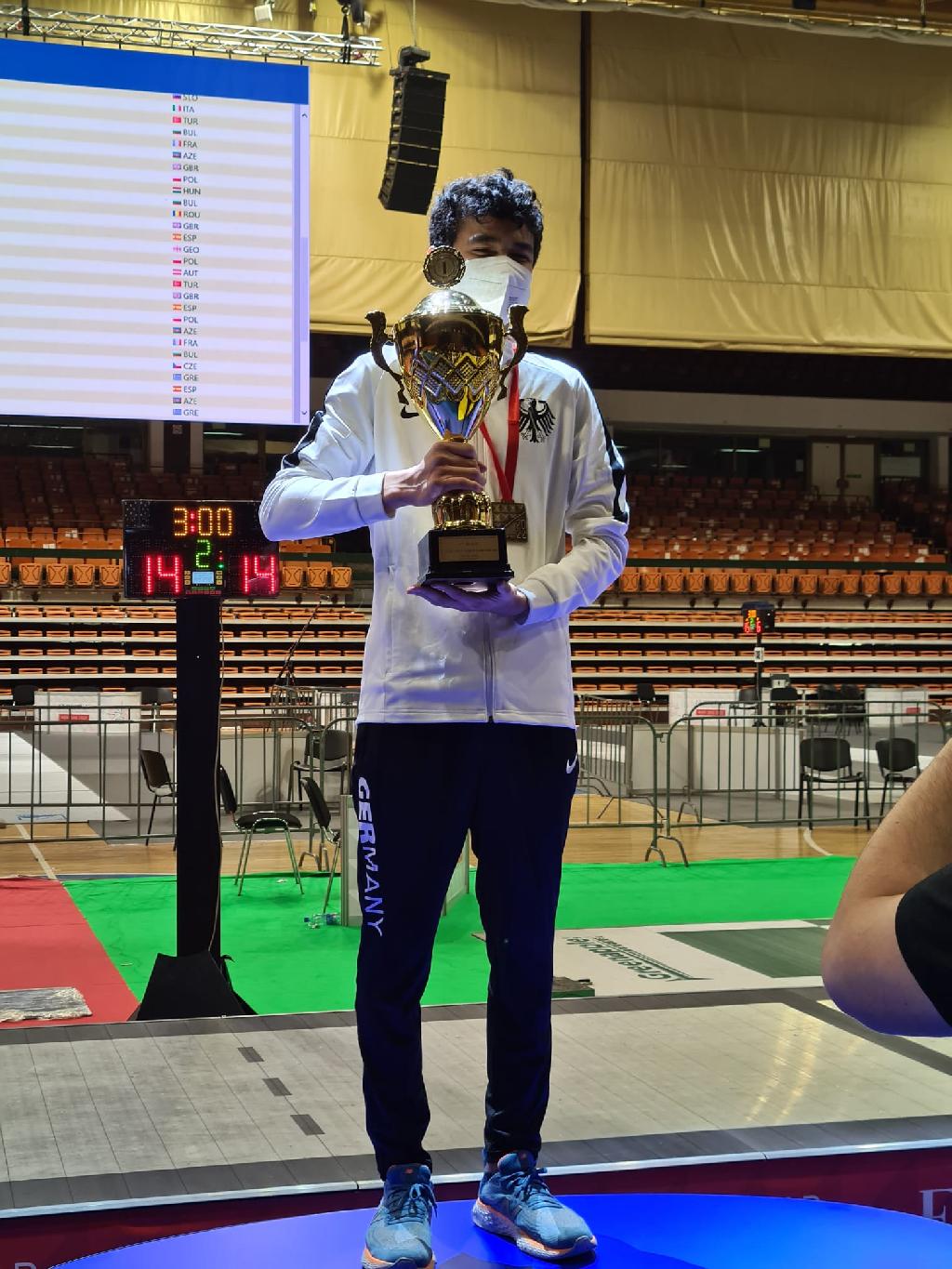 Das war am gestrigen Donnerstag ein großer Paukenschlag als Colin Heathcock von der TSG-Eislingen seine dritte Goldmedaille bei den Jugend Europameisterschaften in Novi Sad holte. Noch nie in der Geschichte der Wettbewerbe war ein Sportler so erfolgreich. Schon in der Vorrunde setzte er mit 5 Siegen ein Zeichen und erfocht sich damit den ersten Platz in der anschließenden KO Runde. Dort erreichte er durch hohe Siege problemlos das Halbfinale in dem Frigyes Godo aus Ungarn auch keine Chance gegen den gut eingestellten Eislinger hatte. Selbst im Kampf um Platz 1. gegen den Franzosen Lucas Guilley ließ Colin seinem Gegner keine Chance und gewann souverän den Europameistertitel der Kadetten im Säbel. |