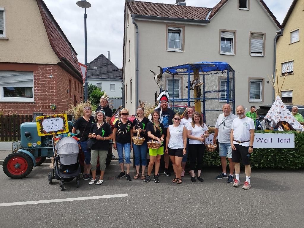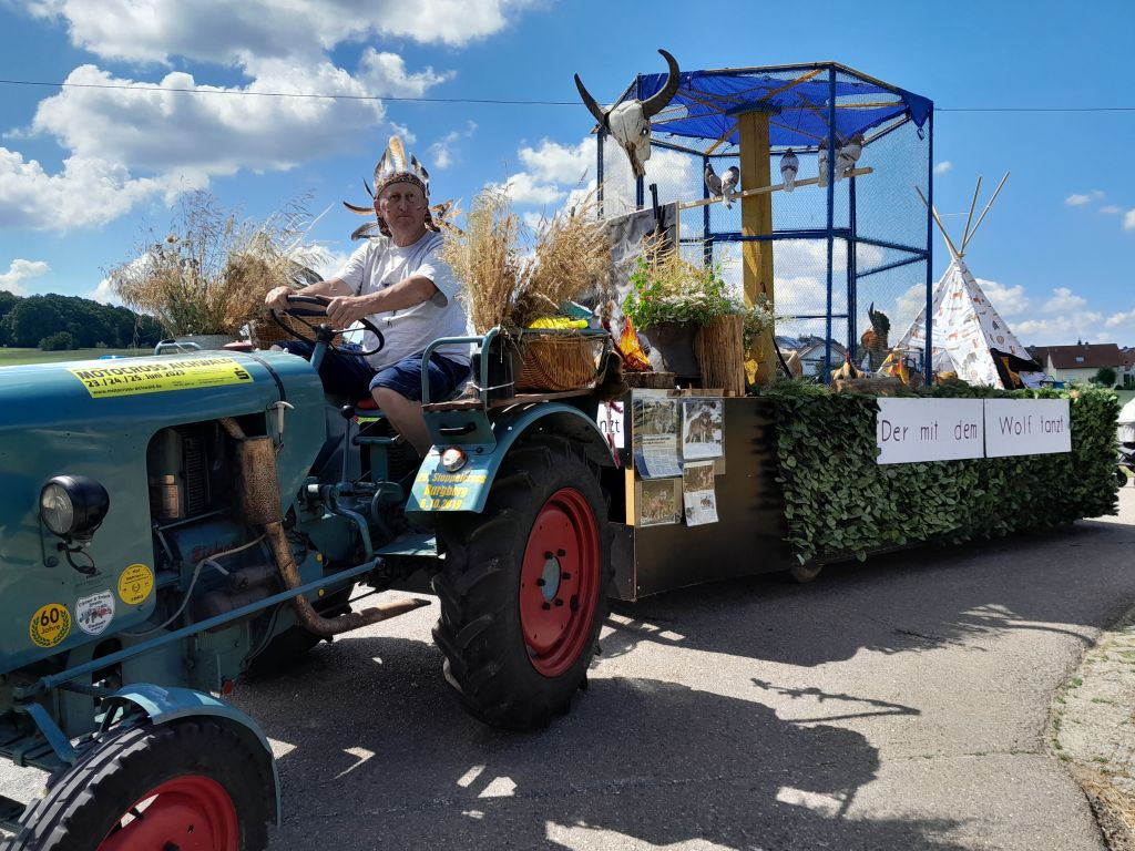 Anläßlich des alle 4 Jahre stattfindenden Kinderfests in Ottenbach unter dem Motto „Die berühmtesten Filme aller Zeiten“ und den Spekulationen um Wolfssichtungen im „Tal der Liebe“ entstand die Idee mit „Der mit dem Wolf tanzt“. Wir warfen uns mit dem Vorstand Franz Raindl als Kevin Costner also in Schale und es stellte sich heraus, daß unser Fahrer „Green“ nach 65 Jahren zum ersten Mal in seinem Leben ein Indianer sein durfte. Das Publikum wurde mit Eiern und Süßem beschenkt und war vom lebendigen Festwagen am 24. Juni begeistert. Doch seht selbst! (Zw.-Phönix, Thüringer Kröpfer, Modena, Chabo) |