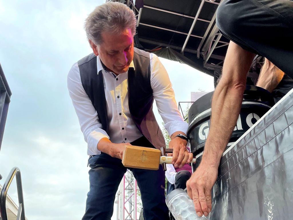 Oberbürgermeister Klaus Heininger brauchte für den Fassanstich zwei kräftige Schläge und dann konnte angestoßen werden.