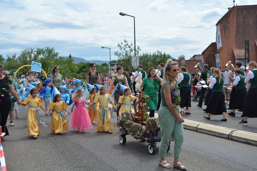 Der bunte Festzug stellte mit über 4.000 Beteiligten in 60 verschiedenen Gruppen einen neuen Rekord auf. Kreativ präsentierten sich die einzelnen Gruppen und boten den ein oder anderen Hingucker und nasse Erfrischung. Für einen gleichmäßigen Marschschritt sorgten unterschiedliche Musikvereine und eine Delegation aus der Partnerstadt Oyonnax rief den jubelnden Zuschauern ein beherztes „Bonjour“ zu.