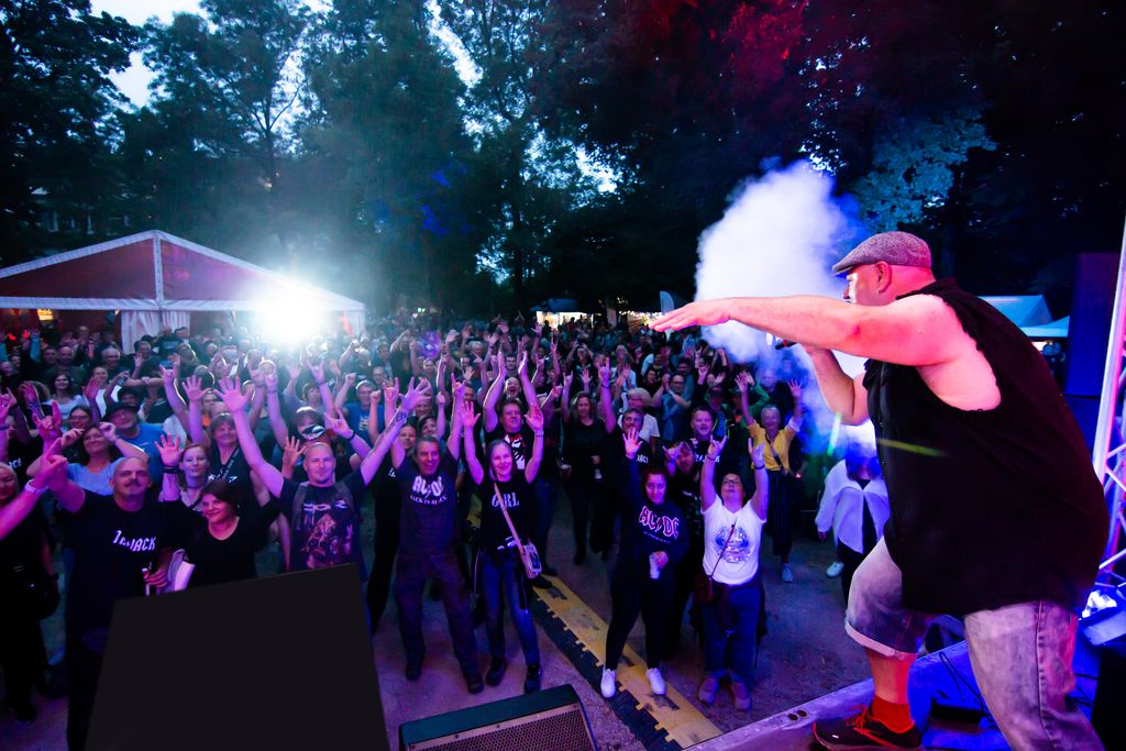 Mit zwei kräftigen Schlägen brachte Oberbürgermeister Klaus Heininger beim Fassanstich das Festbier zum Laufen. Mit zünftiger Musik der Stadtkapelle des Musikvereins Eislingen wurde auf das Stadtfest angestoßen. Anschließend begeisterten „Die Original Vögel“ mit Party- und Schlagerhits ihr gutgelauntes Publikum. Gleichzeitig brachte die ACDC-Coverband „The Jack“ den Schlosspark zum Beben.