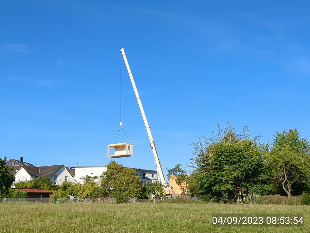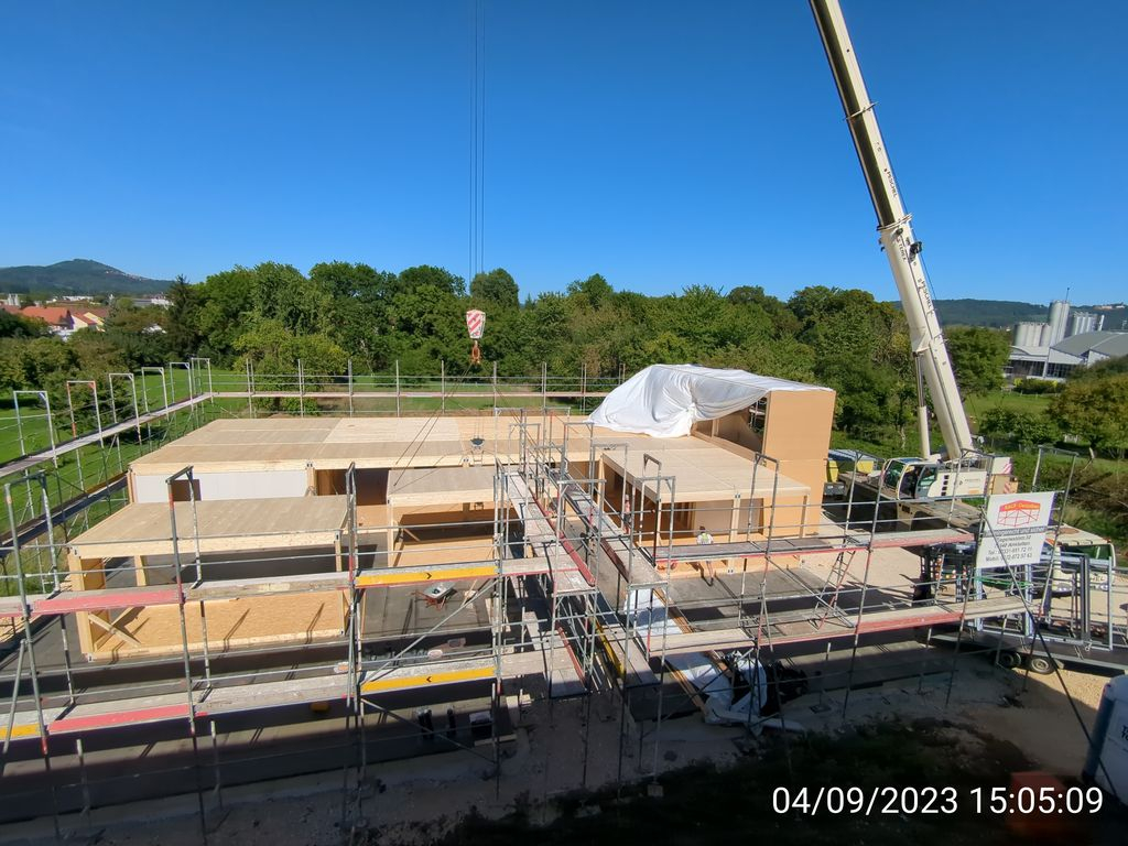 Zwei Schwerlasttransportern befördern aktuell die vorproduzierten Holzmodule im Pendelverkehr auf die Baustelle im Beund. Vor Ort lädt ein 100 Tonnenkran die Module ab und bringt sie an den richtigen Platz. Das Aufrichten der 53 Holzmodule wird Ende dieser Woche abgeschlossen. Im nächsten Schritt werden dann die Fenster eingebaut und mit dem Innenausbau begonnen. Die Arbeiten werden zum neuen Jahr abgeschlossen. Je nach Witterung wird auch schon der Außenbereich gestaltet. |