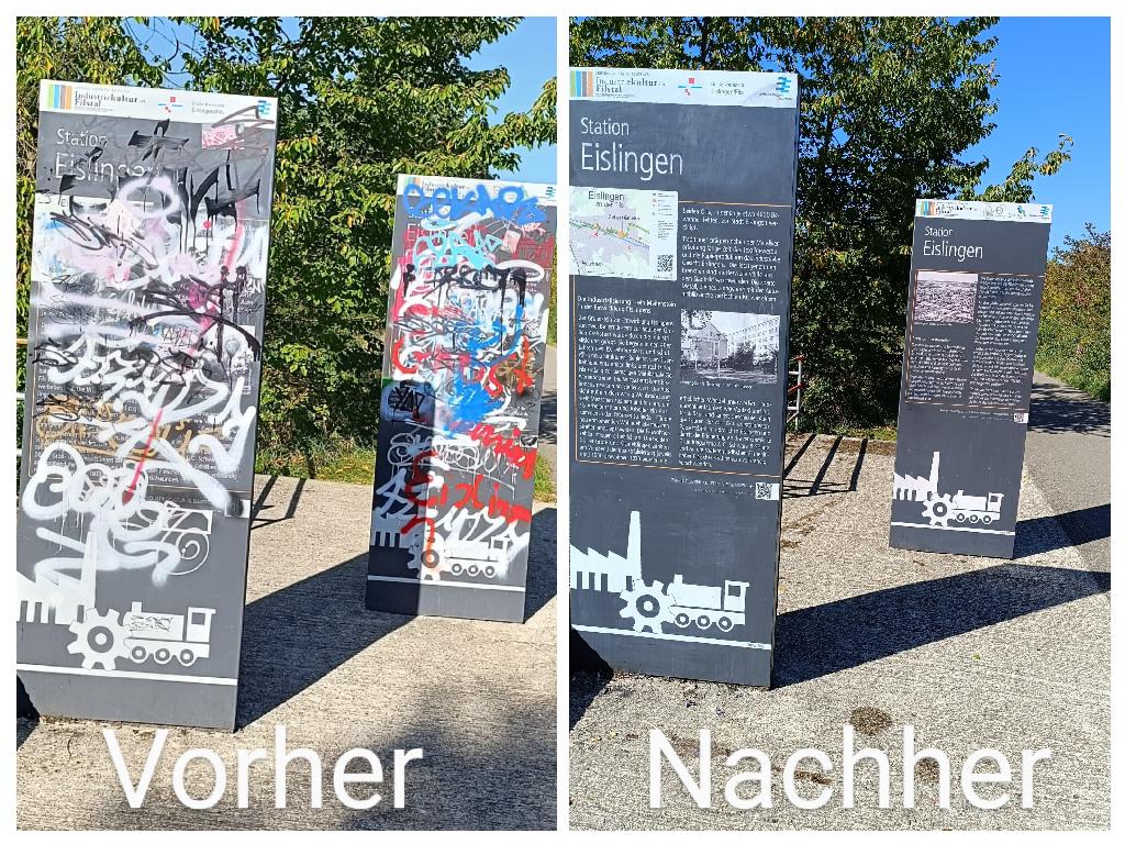 Zum ersten Mal haben wir uns auch um Verschmutzungen durch Sprühfarben gekümmert. So konnten wir zumindest 3 der 4 Infotafeln am Radweg der Fils von Schmierereien befreien. Nach diesen ersten Erfahrungen mit dieser Art von Verschmutzungen und Versuchen mit verschiedenen Reinigern, wird dies zukünftig wohl einfacher sein.