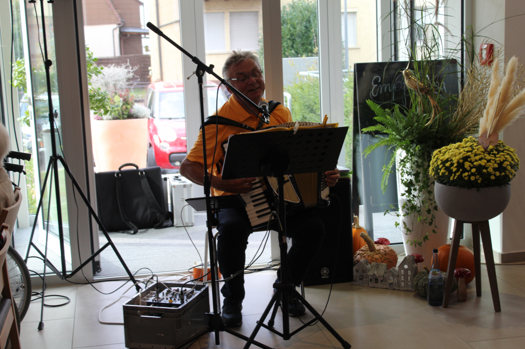 Für die musikalische Umrahmung wurde Helmut Nickl eingeladen, der bekannte Lieder auf seinem Akkordeon spielte. Unsere Gäste sangen laut mit und einige tanzten mit unseren Mitarbeiterinnen.