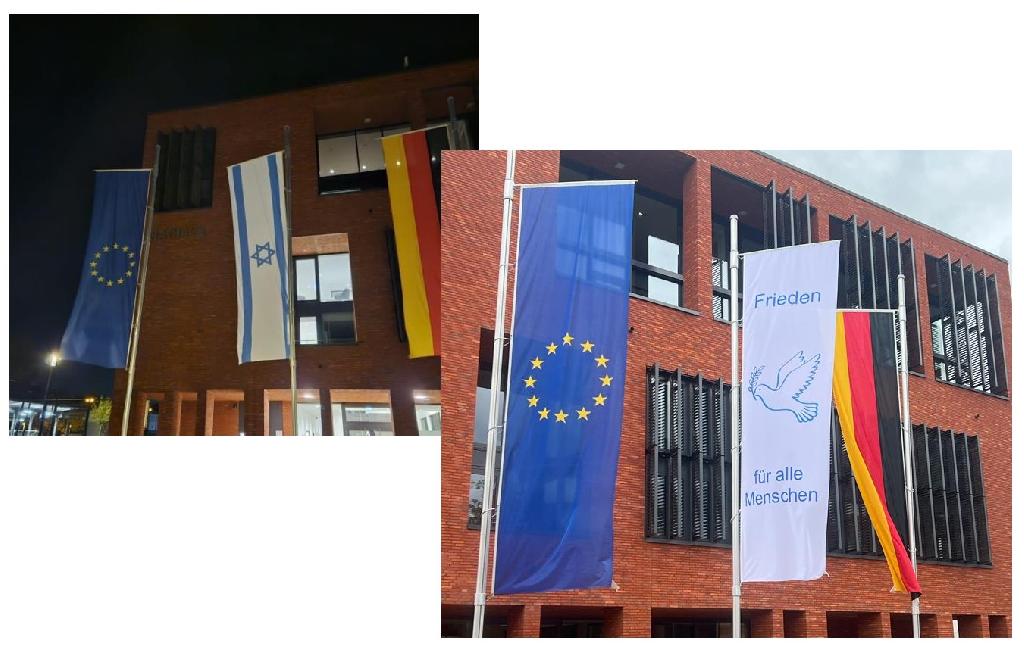 Bei nur einer Gegenstimme (CDU Stadtverbandsvorsitzenden Axel Raisch) hat der Eislinger Gemeinderat der Beschlußvorlage der Verwaltung zum Wechsel der Fahnen vor dem Rathaus zugestimmt, die zum Gedenken an das Massaker der Hamas gehisste Fahne Israels durch eine Friedensfahne zu ersetzen.