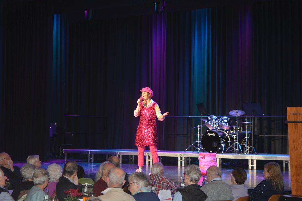 Kabarettistin Marlies Blume führte durch das bunte Bühnenprogramm in der Eislinger Stadthalle, bei der die ältesten Bürgerinnen und Bürger der Stadt geehrt wurden.