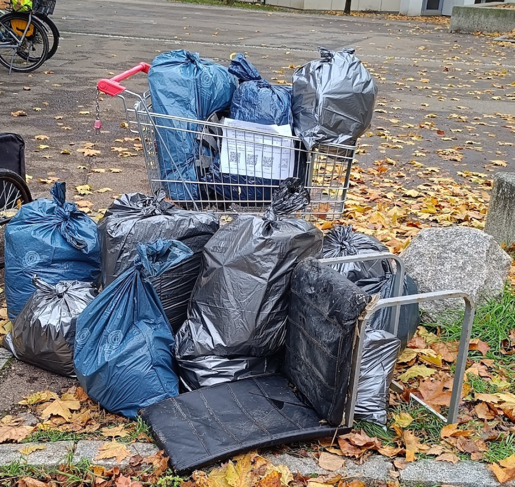 Am Samstag am 25. November 2023 haben sich die Müllsammler*innen von Cleanup Eislingen an der St. Markus Kirche getroffen. Bereits auf dem Weg zum Treffpunkt wurden wir vor der Fußgänger-Unterführung am Bahnhof aktiv, um den Müll von einer umgefallenen Mülltonne zu entsorgen. Ein gefundener Einkaufswagen war dabei eine willkommene Transporthilfe.