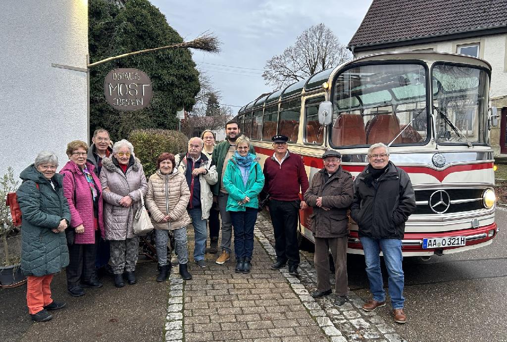Auch wenn die Temperaturen eher an einen Frühjahrsausflug erinnerten, spätestens im Obstweinkeller des Mostbesens bei Kerzenschein kam weihnachtliche Stimmung bei den Teilnehmerinnen und Teilnehmern der AWO Weihnachtsfahrt auf. Vom Filstal ging es mit der Sonja, einem Mercedesbus aus dem Jahr 1963, mit 110 PS über den Aasrücken, Schwäbisch Gmünd, Leintal an Obergröningen zum Ostalbmostbesen. Dort erwartete die Teilnehmerschar der Genuß von drei verschiedenen Mosten. Natürlich kam auch das leibliche Wohl nicht zu kurz. |