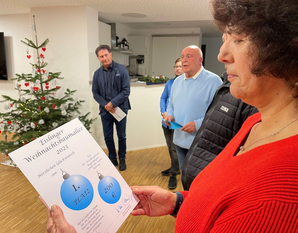 Ein großer Dank von Jochen Weller galt allen Eislinger Betrieben, die als Sponsoren die Geldpreise für die Gewinner zur Verfügung stellten und zudem alle 50 Weihnachtsbäume stifteten. Den ersten Platz in der Kategorie „Vereine“ räumte die TSG Leichtathletik Gruppe U14 ab. Gefolgt vom Mädchenfußball des ASV auf Platz 2 und auf Platz 3 kam der „Treff im Löwen“. Bei den Schulen schaffte es die Stufe 2 des Erich Kästner Gymnasiums auf das Siegertreppchen. Platz 2 ging an die Klasse 5d der Dr.-Engel-Realschule und über Platz 3 und 4 durften sich die Klasse 6b des Erich Kästner Gymnasiums und die Klasse 4a der Silcherschule freuen. In der Kategorie Kindergarten räumte der Ev. Kindergarten Regenbogen mit klarem Stimmenvorsprung den 1. Platz ab. Als Sahnehäubchen obenauf wurde der hübsch geschmückte Baum zum Stimmenkönig und holte sich damit auch noch den Gesamtsieg. „Der Erfolg lag auf der Hand“, erzählte Jochen Weller heiter. Die Kindergartengruppe hatte am Weihnachtsmarkt auf besonders einfallsreiche Weise die Werbetrommel für ihr Bäumchen gerührt. Mit einem weihnachtlichen Ständchen überzeugten die Kinder in kurzer Zeit ihr Publikum. Dafür übte sich im Anschluss eine 20 m lange Warteschlange gerne in Geduld, um für diesen Baum zu voten. Den 2. Platz belegte das Kinderzentrum Christuskirche, dicht gefolgt vom Kinderhaus Ziegelbach auf Platz 3, dem Kindergarten Piccolino auf Platz 4 und der Kindertagespflege Seepferdchen auf Platz 5. Das große Engagement, mit dem Eislinger Kinder, Schüler, Eltern und Vereine gemeinsam die Dekorationen für ihre Weihnachtsbäume mit viel Liebe zum Details basteln, macht die Aktion jedes Mal besonders, so Jochen Weller. Sein Dank galt auch Dennis Geywitz, der ihn bei der Durchführung immer zuverlässig unterstütze. Oberbürgermeister Klaus Heininger bedankte sich in diesem Rahmen bei allen Mitwirkenden ganz herzlich.