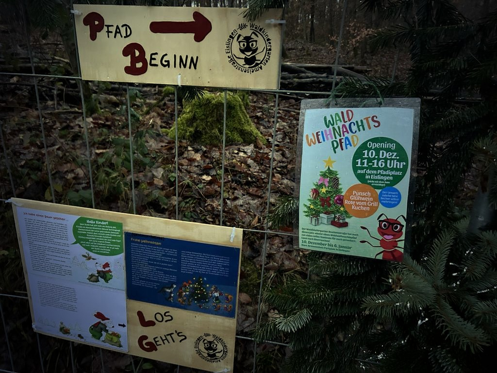 Eine tollte Aktion, die sich jedes Jahr der Waldkindergarten Ameisenstraße in Eislingen einfallen lässt. Auf dem ehemaligen Trimmdichpfad beim Parkplatz Brentenholz erwartet die Kleinen und Großen ein abenteuerlicher Pfad durch eine Waldweihnachtswelt. Aufgelockert werden die Installationen durch Spielangebote. |