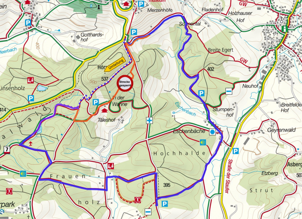 Die Strecke selbst ist mit den seit Jahren bewährten Holzpfeilen aus Peter Schirlings Werkstatt ausgeschildert. Wegen Waldarbeiten musste allerdings vor dem Wannenhof eine Umleitungsstrecke ausgeschildert werden.