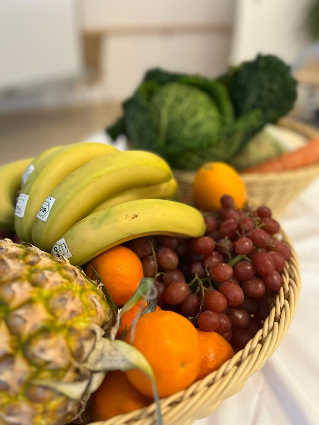 Jeden Morgen gab es am dekorierten Marktstand im Atrium viele leckere gesunde Köstlichkeiten wie z. B. Smoothies, frisches Obst oder verschieden Hülsenfrüchte.