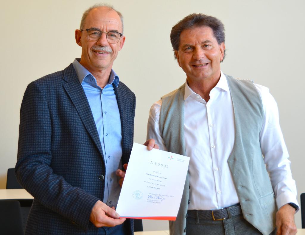 Nach fast 40-jähriger Tätigkeit erhält Achim Vogt seine Entlassungsurkunde von Oberbürgermeister Klaus Heininger, der ihm für die zuverlässige und engagierte Zusammenarbeit dankte.