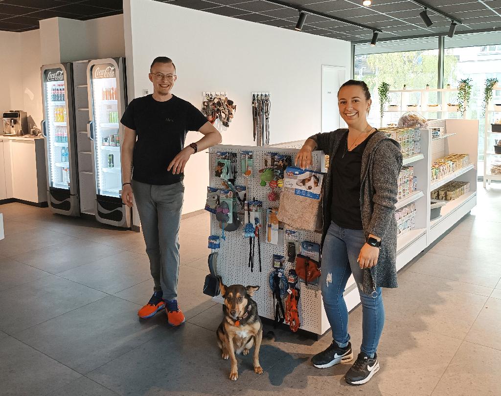 Aylin und Alexander Schmalenberg mit Hündin Malu sind die neuen Pächter des Geschäftes im Mobilitätspunkt.