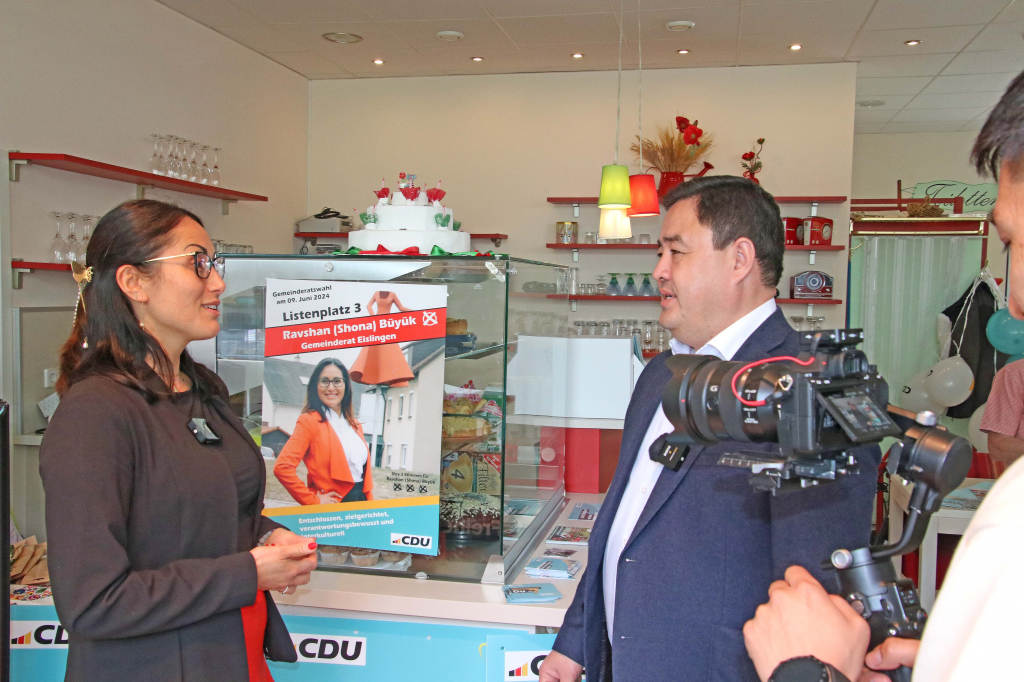 Aus diesem Grunde war seit zwei Jahren auch ein Porträt Lehrerin Shona Büyük geplant. Dass die 38-Jährige nun auch für ein politisches Mandat kandidiert, und das auf einer Liste, die auf den ersten Blick ungewöhnlich zu sein scheint, weckte das besondere Interesse des kirgisischen Senders, weshalb die Journalisten auf ihrem Weg nach Paris einen Zwischenstopp im Eislinger Wahlkampf machten.