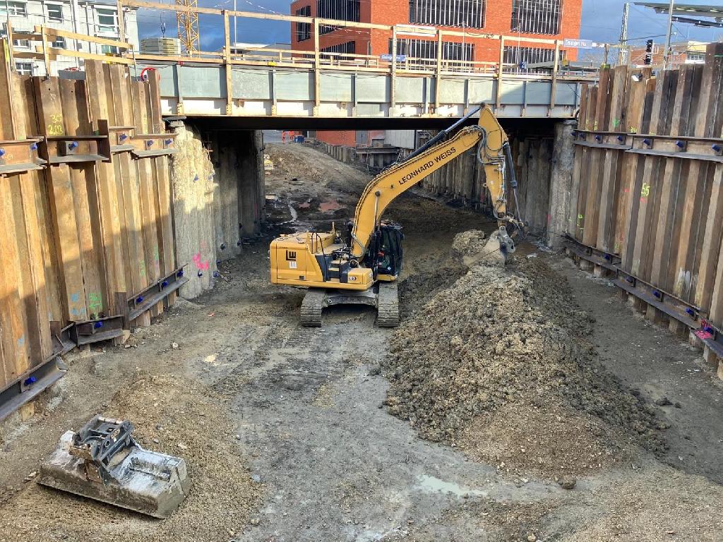 In den letzten Monaten stellten Baufachleute zwei 14 Meter tiefe Bohrpfahlwände quer zu den Gleisen. Dafür war im Oktober die Bahnstrecke 4700 für eine Woche voll gesperrt. Anschließend verlegten die Baufachleute Gleise auf Hilfsbrücken, um die Baugrube zu überspannen. Nachdem die Spundwände in den nördlichen- und südlichen Anschlussbereichen – die späteren Rampen der Bahnunterführung – errichtet waren, begannen die Baufachleute Mitte November mit dem Aushub der ca. 9,50 Meter tiefen Baugrube in drei Schritten. So konnten auf zwei Ebenen die sogenannten ‚Verpressanker‘ in das Erdreich gebohrt werden. Die Anker reichen 20 Meter tief in die Erde und halten die beiden Bohrpfahlwände, um dem Erddruck standzuhalten. „Als nächster Schritt wird nun die Sohle der Baugrube so hergestellt, dass die Bodenplatte der neuen Bahnunterführung betoniert werden kann“, erläutert Thomas Müller, Bauleiter der Stadtverwaltung.