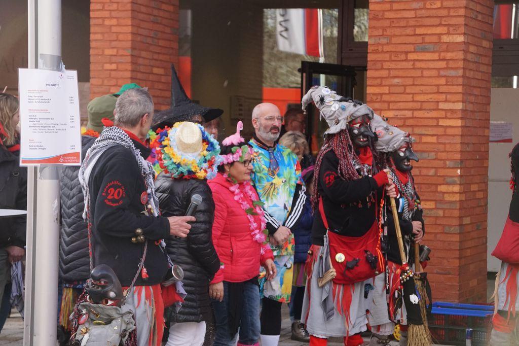 Vor dem Rathaus wurde wieder die Lokalpolitik humorvoll auf die Schippe genommen. Die Frage nach der Höhe des Stelzenläufers begründete der Rathauschef als Angebot an die höhersitzenden LKW-Lenker. Der Fragenkatalog an das Rathausteam wurde mit einer Sammelaktion unter der anwesenden Bevölkerung verknüpft. Jeder falsche Antwort folgte eine Sammelaktion, was OB Heininger schmunzelnd mit dem Hinweis auf die Realität kommentierte: Wenn im Rathaus was falsch läuft, muss auch die Bürgerschaft zahlen.