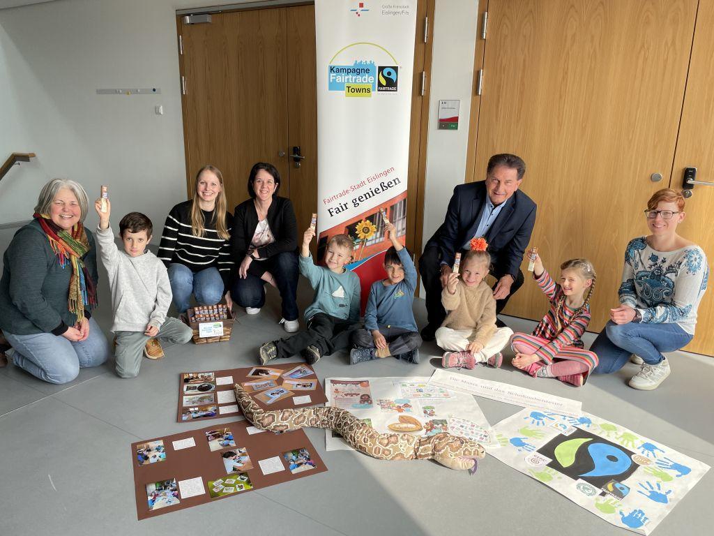 Auf selbstgestalteten Plakaten zeigten die Kleinen, was sie alles erlebt und gelernt haben. Ein Besuch im Globalen Klassenzimmer in Göppingen, bei dem es echte Kakaoschoten zu bestaunen gab, hinterließ ordentlich Eindruck. Dabei lernten die Kinder Allgemeines über Kakao, wie aus einer ungerösteten Kakaobohne Schokolade wird und was fairer Handel bedeutet. Ein besonders weit angereister Gast war ebenfalls dabei: Die Schlange KIKI KAO wohnt eigentlich im Regenwald und hat den Kindern von einer Familie erzählt, die dort auf einer Kakaoplantage arbeitet. „Teilweise müssen die Kinder bereits früh morgens im Dunkeln arbeiten gehen“, erinnerten sich die Kinder. Deshalb ist es wichtig, auf die verschiedenen Siegel zu achten, damit sicher ist, dass hinter den Produkten keine Kinderarbeit steckt. Als Abschluss des Projekts gab es von Oberbürgermeister Klaus Heininger einen Schokoriegel - fair gehandelt, wie die Kinder sofort erkannten.