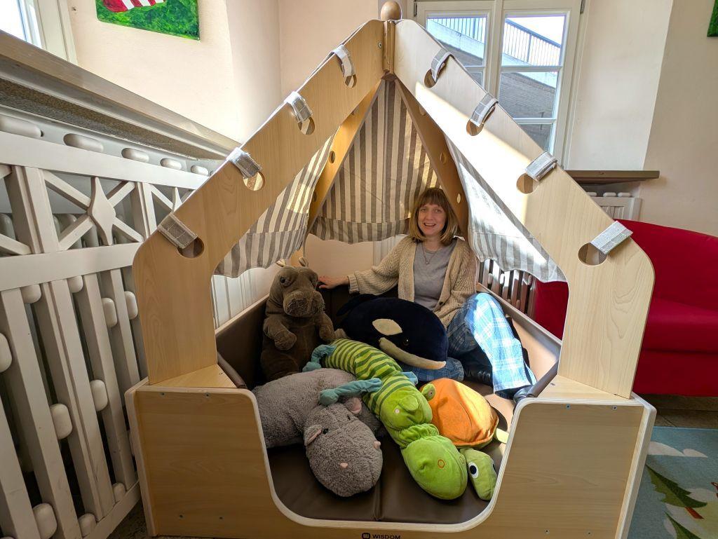 Zur Vorbereitung auf die Nacht der Bibliotheken hat es sich die Leiterin der Kinderabteilung der Stadtbücherei Katharina Immendörfer schon einmal mit den Kuscheltieren gemütlich gemacht.