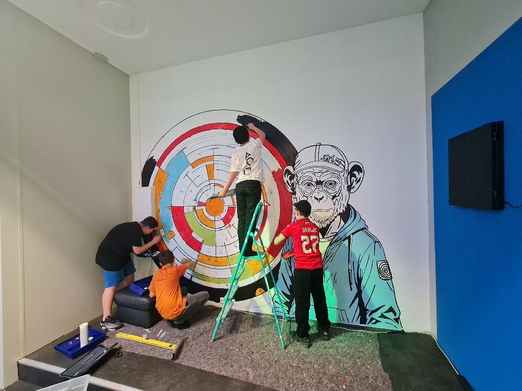 Vier Jugendhausbesucher malen das neue Motiv im Nonstop an die Wand.