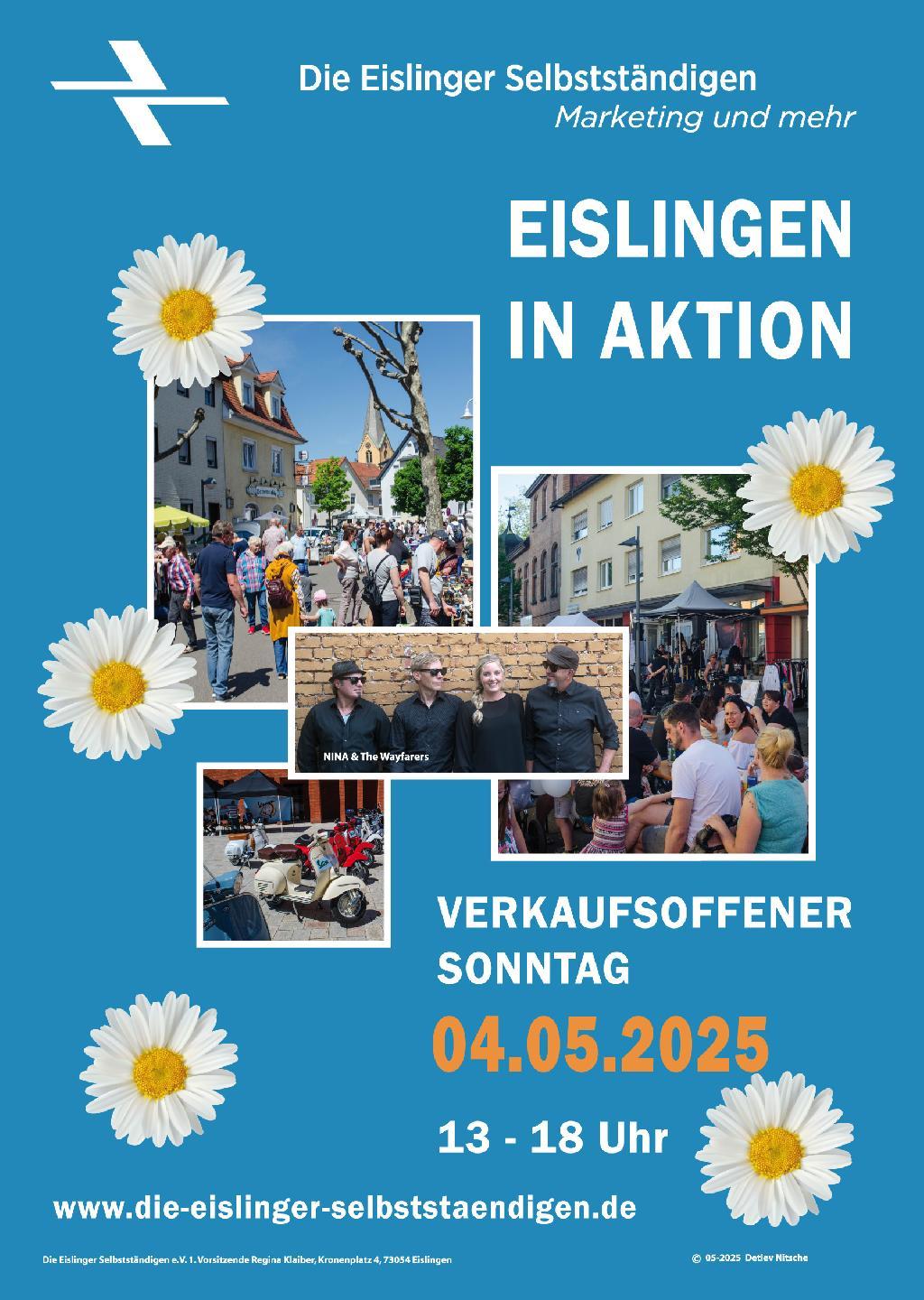 Am 04.05.2025 präsentieren die Eislinger Selbstständigen von 13-18 Uhr Eislingen in Aktion zum Verkaufsoffenen Sonntag. 27 Firmen beteiligen sich an diesem Sonntag. Die Eislinger Autohäuser präsentieren Fahrzeuge der aktuellen Modellreihen am Freimannkreisel.