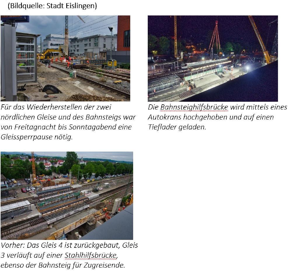 Pendler, die am letzten Freitagnachmittag am Bahnhof Eislingen aus- oder eingestiegen sind, dürften sich am Montag verwundert die Augen gerieben haben. Wo am Freitag ein Abschnitt des Bahnsteigs von Gleis 3 noch in Form einer Stahlbrücke vorhanden war, befindet sich nun wieder ein Bahnsteig aus Beton und Pflastersteinen. Das Gleis 3 und das zeitweise ganz zurückgebaute Gleis 4 auf der Nordseite liegen wieder in einem Schotterbett. Das ganze Wochenende haben mehrere Dutzend Baufachleute auf der Baustelle der neuen Querung der Bahnlinie Hand in Hand gearbeitet. Deshalb kam es am Wochenende auch zu Einschränkungen im Zugverkehr, denn nur die beiden südlichen Gleise waren in Betrieb. Rund um die Uhr und trotz teilweise widriger Wetterbedingungen konnten alle vorgesehenen Arbeiten nach Plan durchgeführt werden. Die Gleise mussten durchtrennt, gelöst und mitsamt der Hilfsbrücke nach oben gehoben und auf einen Tieflader aufgeladen werden. Anschließend wurden der Unterbau und das Schotterbett hergestellt, die Bahnschwellen und die Bahnschienen wieder eingesetzt, verschweißt und befestigt. Besonders aufwändig waren die Arbeiten im Bahnsteigbereich. Auch hier erfolgte zunächst der Rückbau der Bahnsteighilfsbrücke. Die Bohrpfähle, auf denen die Hilfsbrücke aufgelagert war, wurden gekürzt und die notwendigen Kabelverbindungen verlegt. Nachdem der Bahnsteig mit Betonpflaster wiederhergestellt war, konnte er am Montag wieder sicher betreten und genutzt werden. „In der nächsten Zeit werden die Zwischenräume unter den südlichen Gleisen verfüllt und die restlichen Betonblöcke an den Rampen erstellt. Mitte September steht wieder eine Gleissperrpause an. Dann werden die südlichen Bahnsteige hergestellt und die Gleise 1 und 2 verlegt. Danach ist die Baustelle im Bahnhofsbereich abgeschlossen“, gibt Martin Fischer einen Ausblick.