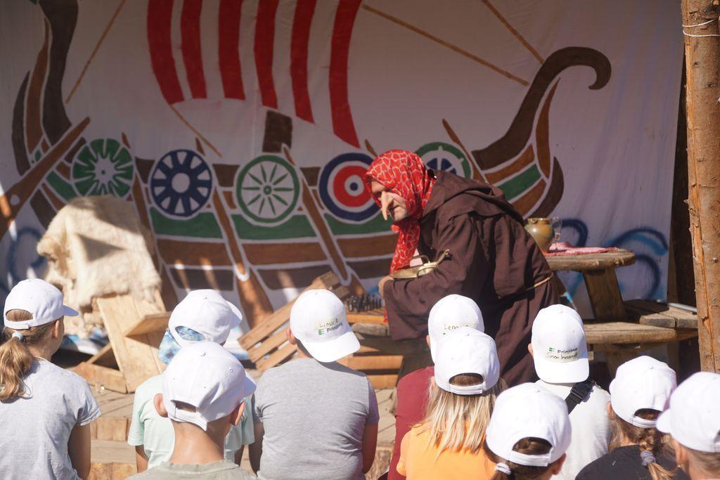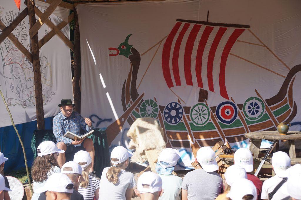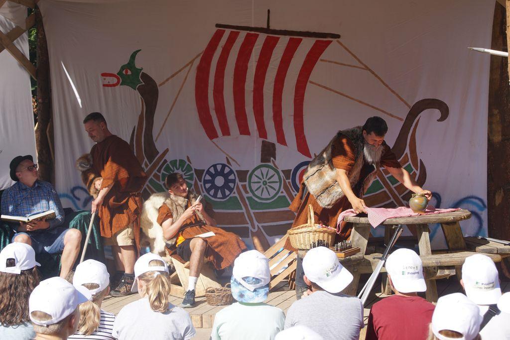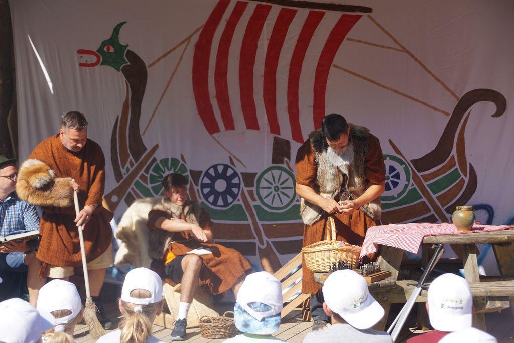 Da staunten die 70 Kinder beim ersten Morgen in der Waldwunderwoche, zweiter Abschnitt. Wikinger, eigentlich als Raufbolde und Kämpfer bekannt, sitzen in der guten Stube, stricken, putzen und pflegen ihre Haut. Da scheint etwas nicht zu stimmen, zumal dann die Hexe sich hämisch freut. |