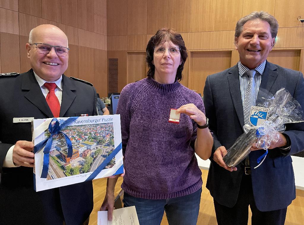 Wer Blut spendet, ist in gewisser Weise ein guter Engel für alle, die Hilfe in Form von Spenderblut benötigen, stellte er die Wichtigkeit der Blutspendenden in seiner Ansprache dar. Etwa 19% des gespendeten Blutes wird zur Behandlung von Krebspatienten benötigt. Die zweithäufigste Verwendung sind Behandlungen von Magen- und Darmkrankheiten und mit gleicher Häufigkeit Behandlungen von Herzerkrankungen. Erst danach folgen Verletzungen durch Unfälle, andere Krankheiten, Komplikationen bei Geburten sowie weitere Einsatzbereiche. „Diesen selbstlosen Akt kann man mit keinem Geld der Welt aufwiegen“, lobte Oberbürgermeister Klaus Heininger das Engagement „Deshalb ist es mir heute wichtig, Ihnen Respekt und Dank zu zollen.“ Die Blutspenderehrennadel in Gold für 75 Blutspenden erhielt Susanne Kämpf. Für 50-maliges Blutspenden wurden Sabine Kress, Doris Ruoß und Markus Straub geehrt. Für 25 Blutspenden ging die Ehrennadel des DRK an Andre Bräunig, Katja Eberhardt, Denis Govorusic, Hubert Hatwig, Martin Holzwarth und Jürgen Schneider. Die Blutspenderehrennadel für 10 Blutspenden erhielten Frank Bucher, Melanie Finteis, Marlene Fischer, Michael Hofele, Eugenia Huber, Eduard Huber, Claus Lehr, Patrizia Mettmann, Ecem Özogul, Friedrich Pauly, Lisa Schneider, Tabea Wahl, Johann Weber, Marion Weißenborn, Günther Weißenborn und Jürgen Ziesche.