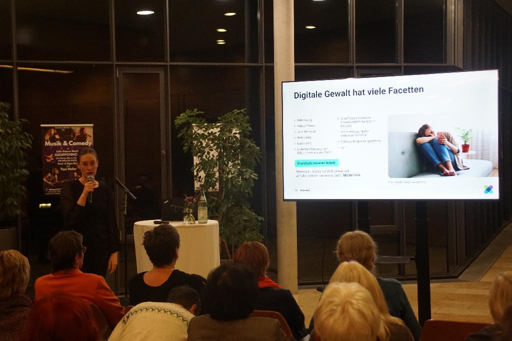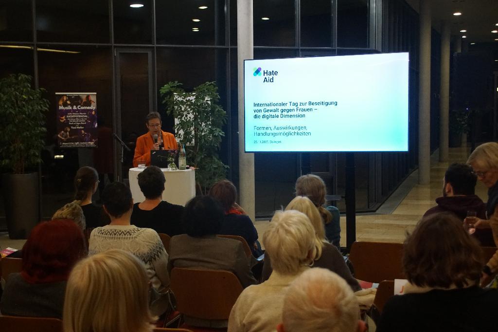 Am 25. November 2025, dem internationalen Tag gegen Gewalt an Frauen, begrüßte die eislinger-frauen-aktion efa e.V. Franziska Benning, Leiterin der Rechtsabteilung der Beratungsstelle HateAid, in der Eislinger Stadthalle. Vor einem interessierten Publikum erläuterte Benning, was digitale Gewalt ist und wie Betroffene digitaler Gewalt ihre Rechte wahrnehmen und sich wirkungsvoll zur Wehr setzen können.